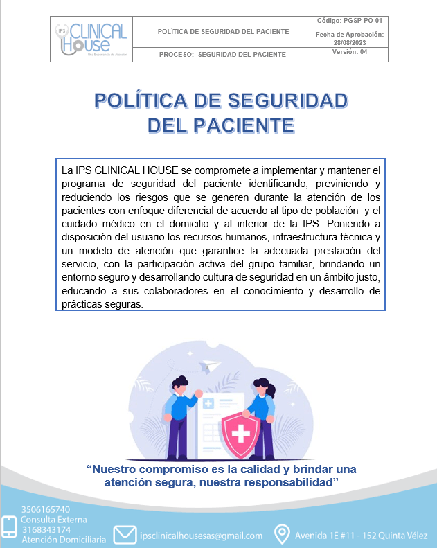 La seguridad del paciente es un pilar fundamental en la atención que brinda la IPS Clinical House. Esta sección ha sido creada para informarte y orientarte sobre cómo participar activamente en tu atención, prevenir riesgos y contribuir a una atención más segura.